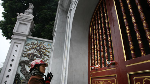 Đền Quán Thánh chưa mở, người đi lễ sớm đành đặt lễ lên khe cửa thắp hương.