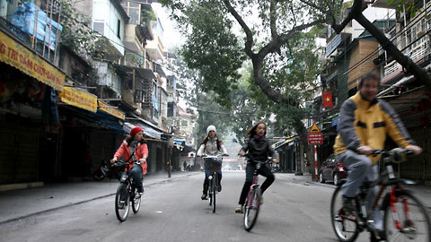 Một gia đình người nước ngàoi đạp xe vòng quanh phố cổ để cảm nhận huơng vị Tết Việt