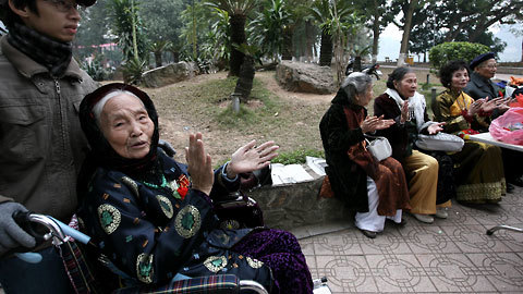 Thời tiết sáng nay tuy có ấm hơn nhưng vẫn rất rét, cụ bà này đã 91 tuổi được chắt đẩy xe lăn ra Hồ Gươm, cụ như trẻ ra khi hòa cùng tiếng hát trong bài “Như có Bác Hồ trong ngày vui đại thắng”.