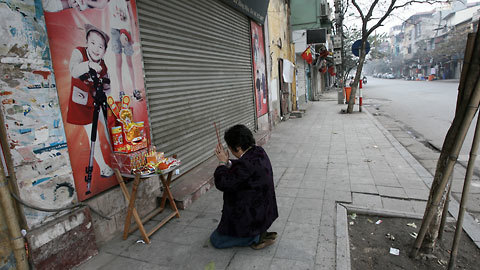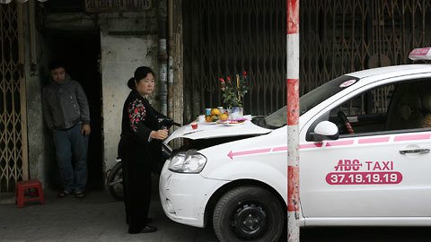 Mẹ của một tài xế taxi đang làm lễ cầu may cho cậu con trai ở trước cửa nhà trên phố Hàng Đậu.