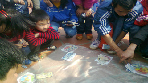 Những ngày tết, trẻ em nào cũng được tiền mừng tuổi. Và, chúng dùng những đồng tiền mừng tuổi mới tinh để đi đánh bạc! (Ảnh Nguyên Minh).