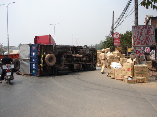 Xe tải lật nằm ngang đường gần Đại học Quốc gia TPHCM