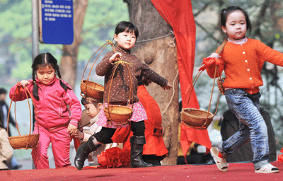 Học trò mầm non của một trường mẫu giáo “xịn” tại Hà Nội đang trình diễn màn múa. (Hình: Hoang Dinh Nam/AFP/Getty Images)