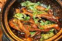 Lưỡi vịt nướng có vị thế riêng cho những buổi hàn huyên. Chiếc nồi đất nóng hổi, thơm ngát, từng cái lưỡi vịt đậm màu nổi bật trên nhưng cọng rau răm xanh mát của trong buổi chiều mưa thật khó cưỡng với thực khách.