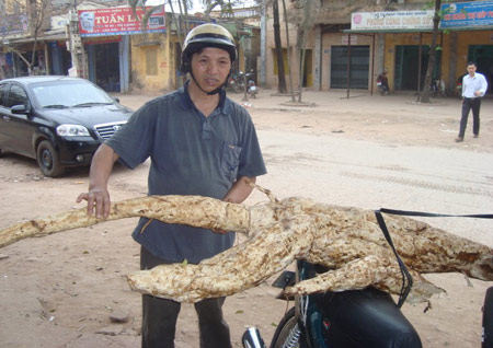 Ông Nguyễn Cao Khải, 64 tuổi, ở khu Quang Trung – thị trấn Chũ – Lục Ngạn (Bắc Giang) thu hoạch tại vườn nhà.Củ sắn dây được đào hôm 16/4 vừa qua. Khi ông Khải chở củ sắn dây này ra một cửa hàng rửa xe máy ở thị trấn Chũ thuê cọ rửa, nhiều người dân hiếu kì ở thị trấn đã đổ xô đến xem.