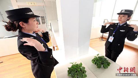 Nữ dân pḥng chỉnh lại trang phục cho ngày đầu tiên làm việc (Ảnh: Chinanews)