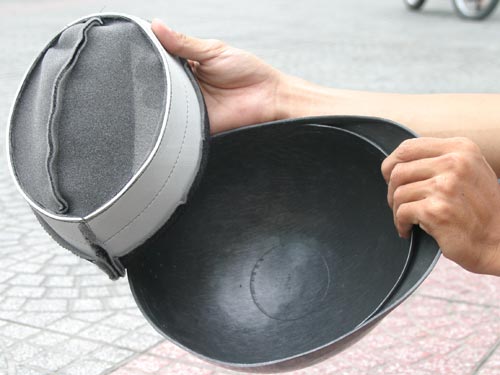 Chúng tôi hỏi loại mũ nào rẻ nhất th́ ông chủ với tay lấy một MBH bị bụi bám dày, bề ngoài nh́n như mũ lưỡi trai, bên trong chỉ có một lớp vải mềm và hoàn toàn không có lớp mút. Trên mũ chỉ thấy một tem nhỏ ghi chữ “thailan”. Ông chủ tiệm chỉ vào cái tem này, phẩy tay bảo: “Ôi, mũ dỏm đó! Được cái nó gọn, nhẹ, đội để đối phó CSGT là chính!”.