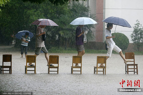 Các sinh viên Trung Quốc di chuyển trên những chiếc ghế xuyên qua sân trường đã ngập nước ở Vũ Hán hôm 18/6. Ảnh: AFP