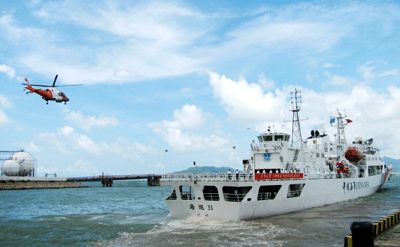 Trong tấm h́nh này, Haixun-31, tàu tuần biển lớn nhất, hiện đại nhất của Trung Quốc trang bị trực thăng rời cảng Chu Hải của tỉnh Quảng Đông. Tiếng là đi thăm viếng Singapore từ ngày 15 tháng 6, 2011 nhưng dư luận báo chí quốc tế tin rằng nhiệm vụ chính của chuyến đi này là nhằm đe dọa các nước trung khu vực khi cuộc tranh chấp biển đảo trên biển Đông ngày một căng thẳng. (H́nh: AP photo/Xinhua)