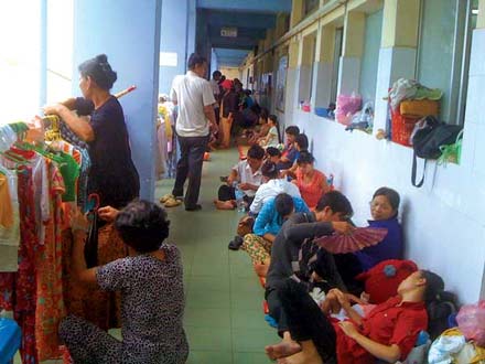 Minh chứng điều này, BS Khanh dẫn chúng tôi đến pḥng bệnh. Hai pḥng 107 và 108 được trưng dụng hoàn toàn để điều trị tay chân miệng. Mỗi pḥng kê 8 - 10 giường, nhưng bệnh nhi nằm ghép 3 – 4 người/giường. Không đủ chỗ, người nhà kê chiếu cho trẻ nằm xuống dưới đất, nằm lan hai bên hành lang bên ngoài, ra tận cầu thang, thậm chí nằm dọc theo hành lang của khoa tiêu hoá ở tầng trệt! Ước tính ngày hôm qua, tổng số bệnh nhi tay chân miệng điều trị ở bệnh viện Nhi Đồng 1 là 180 ca, trong đó có hàng chục ca thở máy, phải theo dơi sát.
