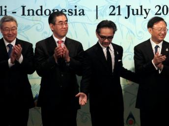 Ngoại trưởng Nhật Bản (thứ 2 trái sang), ngoại trưởng Hàn Quốc (trái), ngoại trưởng Indonesia (thứ 2 phải sang) và ngoại trưởng Trung Quốc (phải) tại buổi khai mạc phiên họp ngoại trưởng ASEAN+3, Bali 21/7/2011./Reuters