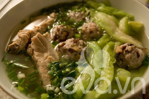 Giờ thì chỉ còn 1 việc nữa là sắp bún ra bát, xếp mọc, dọc mùng, hành, mùi, sườn, cuối cùng là chan nước và... măm măm thôi!