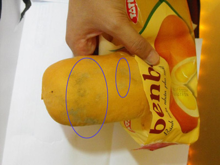 Bác Oanh cho biết: Chiều ngày 1/8, bác có vào siêu thị Fivimart trên đường Hoàng Quốc Việt để mua 03 gói bánh mỳ Banbơ mặn, nhân pho mát cho cháu nhỏ ăn và một số vật dụng gia đ́nh khác. Trên gói bánh mỳ có ghi rơ hạn sử dụng từ 22/7/2011 đến ngày 01/08/2011, vỏ bao b́ vẫn phồng căng như b́nh thường. Tuy nhiên, ngay khi đem về nhà, buổi tối hôm đó, lúc bóc bánh ra cho cháu ăn th́ bác ngạc nhiên phát hiện: Bánh đă mốc xanh từ bao giờ. Hai bề mặt bánh nhuốm một màu đen ng̣m v́ mốc thay v́ màu vàng nhẹ thơm ngon, bắt mắt.