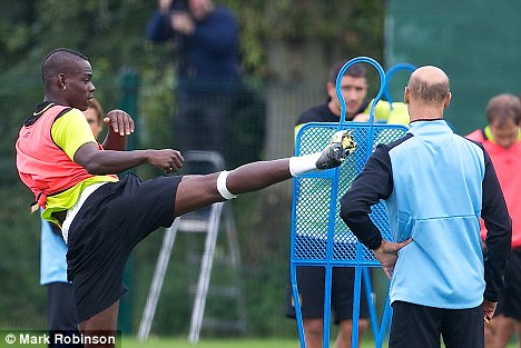 Siêu quậy người Italia đã đấm hình nộm và tung chân đá đầy khiêu khích trên sân tập Carrington, khiến các đồng đội ở Man City khá hoang mang.