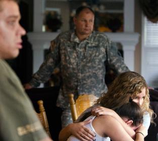 Hai người bạn của Hạ sĩ Spencer Duncan, thiệt mạng trong vụ Taliban bắn rơi trực thăng Chinook, an ủi nhau tại Olathe, Kansas. Trong số 30 quân nhân Mỹ thiệt mạng trong vụ này, có 3 người đến từ Tiểu đoàn 7, Trung đoàn 158, căn cứ tại Olathe. (H́nh: AP Photo/The Kansas City Star, Allison Long)
