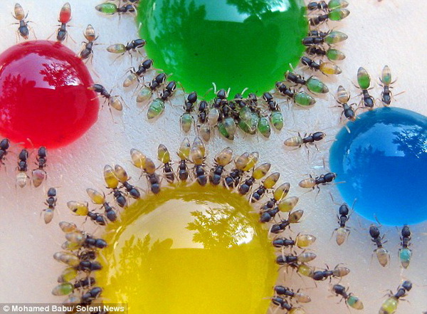 Để kiểm tra sự phán đoán của mình đồng thời tạo ra những bức ảnh rất đặc biệt này, ông Babu dùng nước đường màu đỏ, xanh lá cây, xanh dương, vàng… và “nhử” những chú kiến trong chính khu vườn của mình. “Ý tưởng của những bức ảnh này đến với tôi khi vợ tôi chỉ cho tôi thấy một số con kiến biến thành màu trắng khi chúng ăn những giọt sữa đổ trên bàn bếp của chúng tôi.” Ông Mohamed Babu nói.
