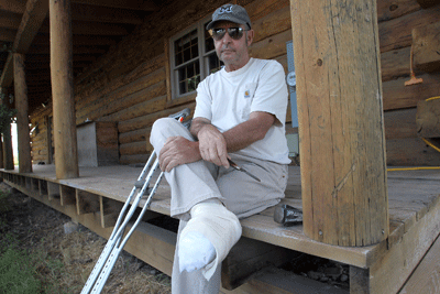 Ông John Hutt, 61 tuổi, ngồi trước hiên nhà, tay cầm cây dao nhỏ ông dùng cắt mấy ngón chân. (Hình: AP/William Woody)