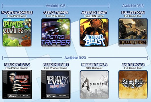 Bên cạnh đó, trong tháng 09/2011 này trò chơi Plants vs Zombies, Astro Tripper và Altered Beast cũng sẽ được cung cấp miễn phí. Ngoài ra còn có các bản chơi thử Bulletstorm của EA, Saints Row 2 của THQ, Bolt và Tiger Woods PGA Tour 12 của Disney. Cũng trong dịp này, 9 tựa game LucasArts Star Wars dành cho PSP cũng sẽ được giảm giá 50%.