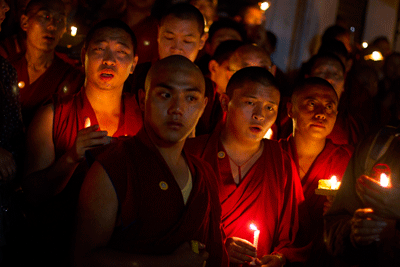 Các nhà sư Tây Tạng lưu vong trong lễ tưởng niệm hai nhà sư vừa tự thiêu tại tỉnh Tứ Xuyên phản đối chế độ cộng sản Trung Quốc. (H́nh: AP Photo/Ashwini Bhatia)