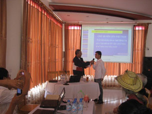 TS Nguyễn Nhă tại buổi thuyết tŕnh về vấn đề Biển Đông tại Hà Nội vào ngày 24/9. Courtesy NguyenTuongThuyBlog.