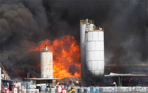 Một bức không ảnh cho thấy gần như toàn bộ nhà máy hóa chất ch́m trong lửa và khói. Ảnh: AP