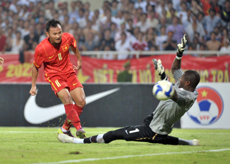 Phải thi đấu trên sân khách và chịu lép vế hơn đối thủ trong suốt 45 phút thi đấu đầu tiên, nhưng mọi thứ đă dần thuận lợi hơn với thầy tṛ HLV Falko Goetz sau giờ nghỉ giải lao. ĐT Việt Nam tạo ra được 2 cơ hội ghi bàn rơ nét, tiếc là những cú dứt điểm của Trọng Hoàng và Công Vinh đều không đủ sắc bén để có thể đánh bại thủ môn đội chủ nhà.
