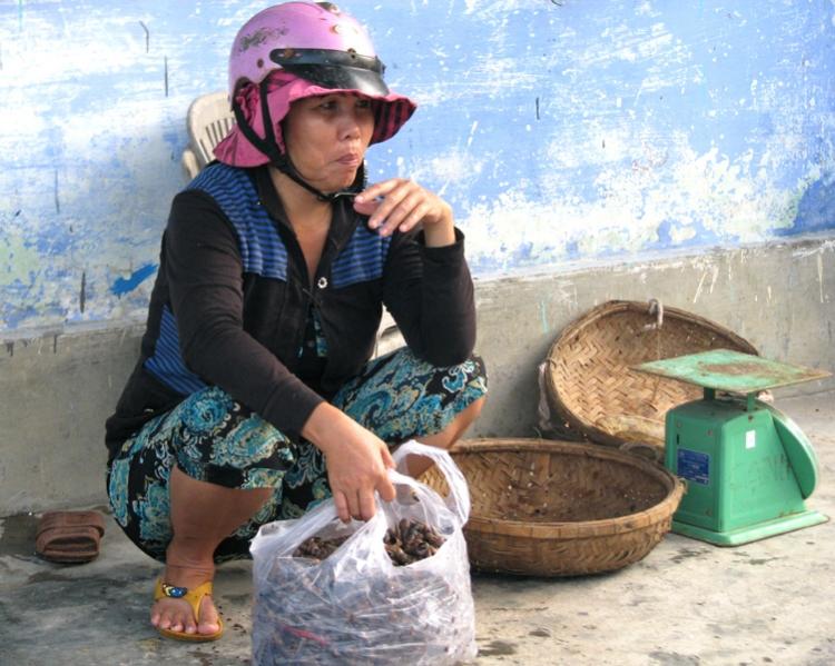 Bà Nguyễn Thị Bé, nạn nhân của “dịch vụ trúng thưởng”, tảo tần bên rổ ốc...