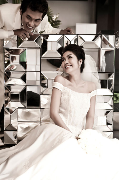 Tuy không cười nhưng ánh mắt biết nói của nữ diễn viên vẫn diễn tả được hạnh phúc của cô dâu. Thời gian này Hà Tăng liên tục biến hóa bằng những bộ ảnh độc đáo.