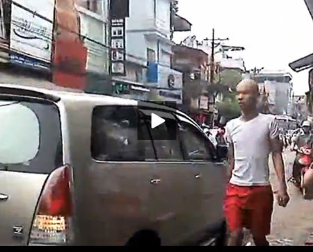 Nhân vật "đầu gấu" đang làm công việc phân làn đường giao thông. Ảnh chụp từ clip