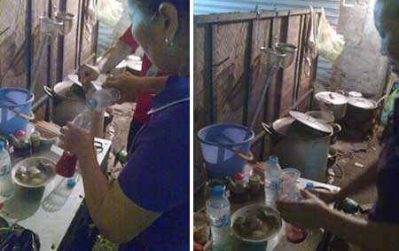 Nh́n cách pha chế của chị chủ, tôi không khỏi hoảng bởi sự mất vệ sinh an toàn thực phẩm cũng như những hệ lụy có thể đem lại cho cơ thể người sử dụng bất cứ lúc nào. Sau khi tách con ngán ra khỏi vỏ, chị chủ tay thoăn thoắn bỏ vào cốc thủy tinh (loại 330ml). Kế đó dùng đôi đũa cho vào rồi xoáy liên hồi.