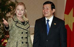 Ngoại trưởng Hillary Clinton và Chủ tịch nước VN Trương Tấn Sang tại Honolulu, Hawaii hôm 10/11/2011. Photo courtesy of state.gov