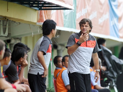 HLV Falko Goetz thúc giục các học tṛ tiến lên. Ảnh: VSI.
