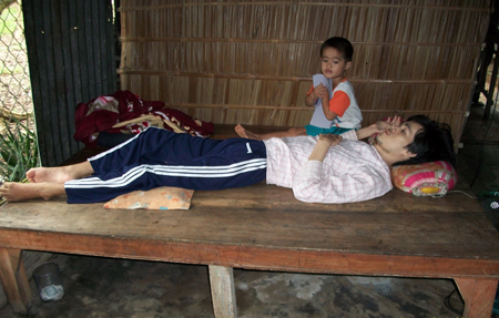 Bà Nguyễn Thị Bảnh (60 tuổi, bị hở van tim 2 lá) – mẹ ruột anh Tình bùi ngùi nói: “Tui và cha nó già rồi, lại bệnh tật nên chẳng giúp gì được cho vợ chồng nó. Giờ thằng Tình nằm liệt một chỗ rồi, tất vả mọi việc một mình con Vân gánh hết, tội nó lắm chú ơi. Lo nhất là số nợ của chủ đại lí gạo và bà con để chạy chữa bệnh tật lúc tai nạn đã lên đến bạc trăm triệu rồi. (139.000.0000 đồng - PV). Không biết đến khi nào mới trả xong cho người ta đây!”