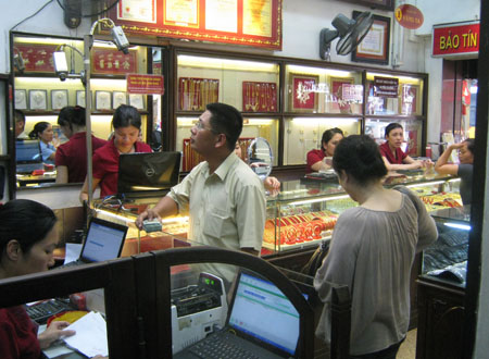 Nhiều khách hàng muốn mua vàng b́nh ổn tại ngân hàng nhưng v́ phải gửi lại nhà băng, nên đành t́m tới các doanh nghiệp vàng khác. Ảnh: Đông Nhiên.