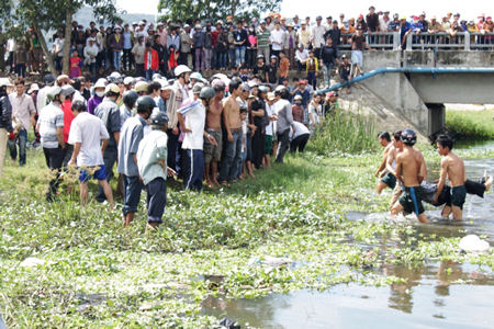 Rất đông người dân hiếu kỳ tụ tập theo dõi việc tìm kiếm xác ông Hùng