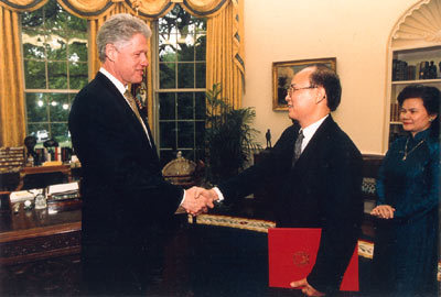 Tổng thống Mỹ Bin Clin-tơn tiếp Đại sứ Lê Văn Bàng tại Lễ trình Quốc thư.