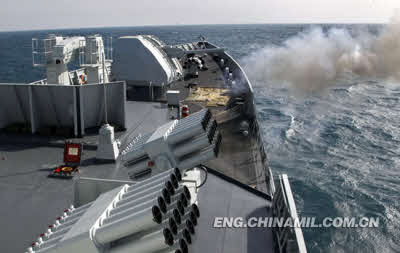 Khu trục hạm Quảng Châu của Trung Quốc tập trận bắn đạn thật trên biển Ðông. (Hình: Chinamil.com)