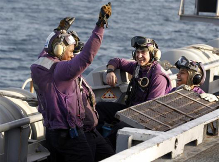 Hầu hết mọi người không biết nhiều đến cuộc sống thường thường ngày của các thủy thủ Mỹ, dưới đây là mộ số hình ảnh được chụp lại về quá trình làm nhiệm vụ và sinh hoạt của thủy thủ Mỹ trên tàu USS Abraham Lincoln hôm 14/2.