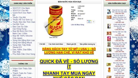 Trên sex shop Mr.N. quảng cáo loại nước hoa kích dục mang tên Rush Quick, có xuất xứ từ Mỹ, giá 1,4 triệu/chai. Đi kèm quảng cáo về tác dụng của lọ nước hoa, người kinh doanh c̣n post lên phần quảng cáo hàng trăm chai nước hoa, mà theo họ là nhập khẩu từ Mỹ theo dạng xách tay cùng khuyến cáo dành cho người sử dụng.