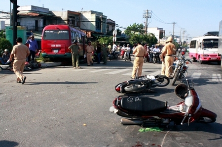 Vào lúc 6h40 sáng nay 30/5, chiếc xe khách BKS 83N-0579 do tài xế Phạm Thành Thới (32 tuổi, quê Đồng Nai) điều khiển, chở theo 14 hành khách từ TP.HCM về các tỉnh Miền Tây đã tông nát hàng loạt xe máy.