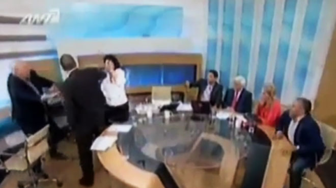 Người dẫn chương tŕnh Giorgos Papadakis phải can thiệp trong vài phút, ông Kasidiaris mới hạ hỏa và bỏ đi.