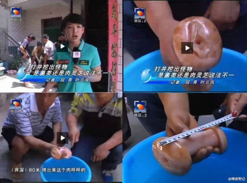 Theo ABC News, vì không thể nhận diện được vật thể hình nấm mềm dẻo tìm thấy khi đang đào giếng, những người nông dân ở làng Lục Thôn Bảo đã gọi đến đài truyền hình địa phương, và đài này ngay lập tức gửi một nữ phóng viên trẻ tuổi đến hiện trường.