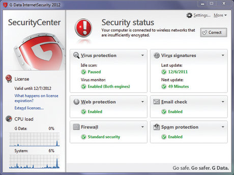 Giao  diện chưa thực sự xuất sắc nhưng G-Data InternetSecurity 2012 giữ vị  trí quán quân với khả năng phát hiện, ngăn chặn và loại bỏ các thành  phần malware đang hoạt động dựa trên CSDLND lẫn thời gian thực. Bộ phần  mềm này cũng ít chiếm tài nguyên và ít ảnh hưởng đến hiệu suất hệ thống.