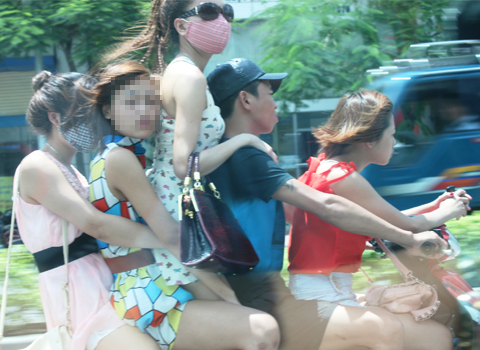 5 người không đội mũ bảo hiểm chạy trên đường Nguyễn Văn Cứ, Q. Long Biên, Hà Nội. Ảnh: Thanh