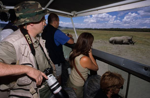 Khách du lịch đang xem một con tê giác sừng trắng tại Hồ Nakuru, Kenya, Châu Phi hôm 15/6/2008./AFP photo