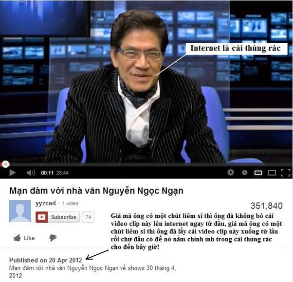 Vậy mà ông NNN lại cho rằng Internet là cái thùng rác. Hồ đồ như vậy vô tình ông NNN đã tự vạch áo cho thiên hạ biết mình là kẻ dốt nát (ignorant). Đồng ý với ông là Internet cũng có mặt xấu của nó. Tuy nhiên xấu hay tốt là do sự lựa chọn của mình nhất là đối với người hiểu biết. Nếu ông Ngạn vào Internet để xem hình, xem phim XXX thì ông Ngạn xấu chứ đâu phải Internet xấu.