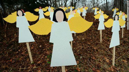 | H́nh thiên thần bằng gỗ tượng trưng cho 27 nạn nhân trong vụ xả súng được đặt trên một ngọn đồi ở Newtown. |
