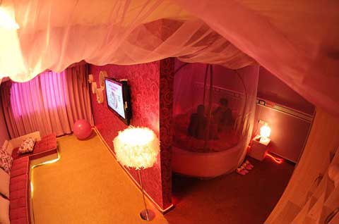 Những chiếc giường mang hình tròn với chăn, rèm, các vật trang trí xung quanh, đèn đều mang màu hồng, đỏ, và thậm chí có cả các món đồ chơi tình dục.. dễ làm khơi dậy sự ham muốn của con người khi bước chân vào đây.