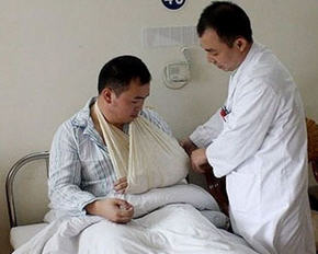 Anh Zhou Zheping, một cảnh sát biên phòng ở Thâm Quyến, Trung Quốc, sau khi lao mình đỡ thiếu nữ trẻ tự tử đã bị trật khớp tay trái, thâm tím mặt còn mắt thì bị sưng.