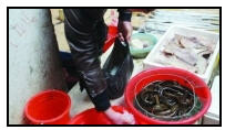 Quan sát những con cá ông Vương đã mua, phóng viên nhận thấy, chúng có kích cỡ giống cá bình thường, chỉ điều thân cá thẳng đuột và không nhìn thấy nội tạng, điều bất thường nhất là ở mắt của cá, chỉ cần lấy tay chà xát nhẹ là rơi ra mà không để lại dấu vết.